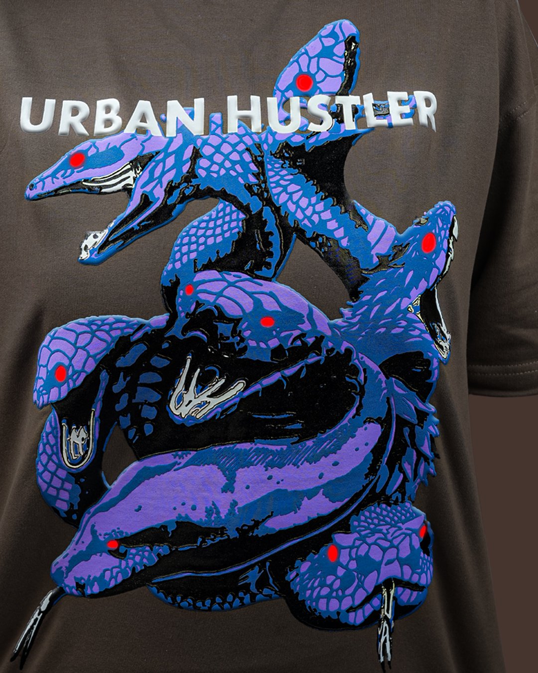 Bold brown oversized t-shirt featuring a multi-headed snake (Hydra) in striking blue & purple tones with “Urban Hustler” branding. Made with 280 GSM heavyweight cotton for premium streetwear durability.